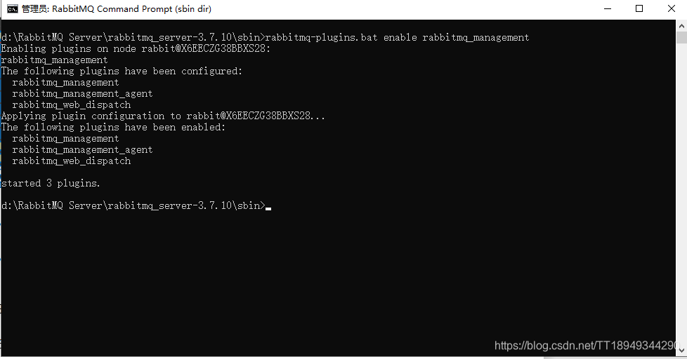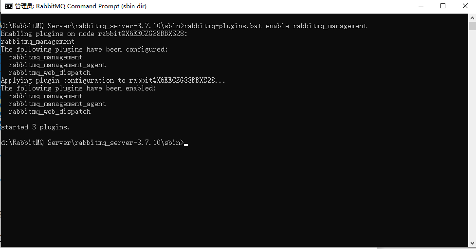 然后输入指令激活插件:rabbitmq-plugins.bat enable rabbitmq_management