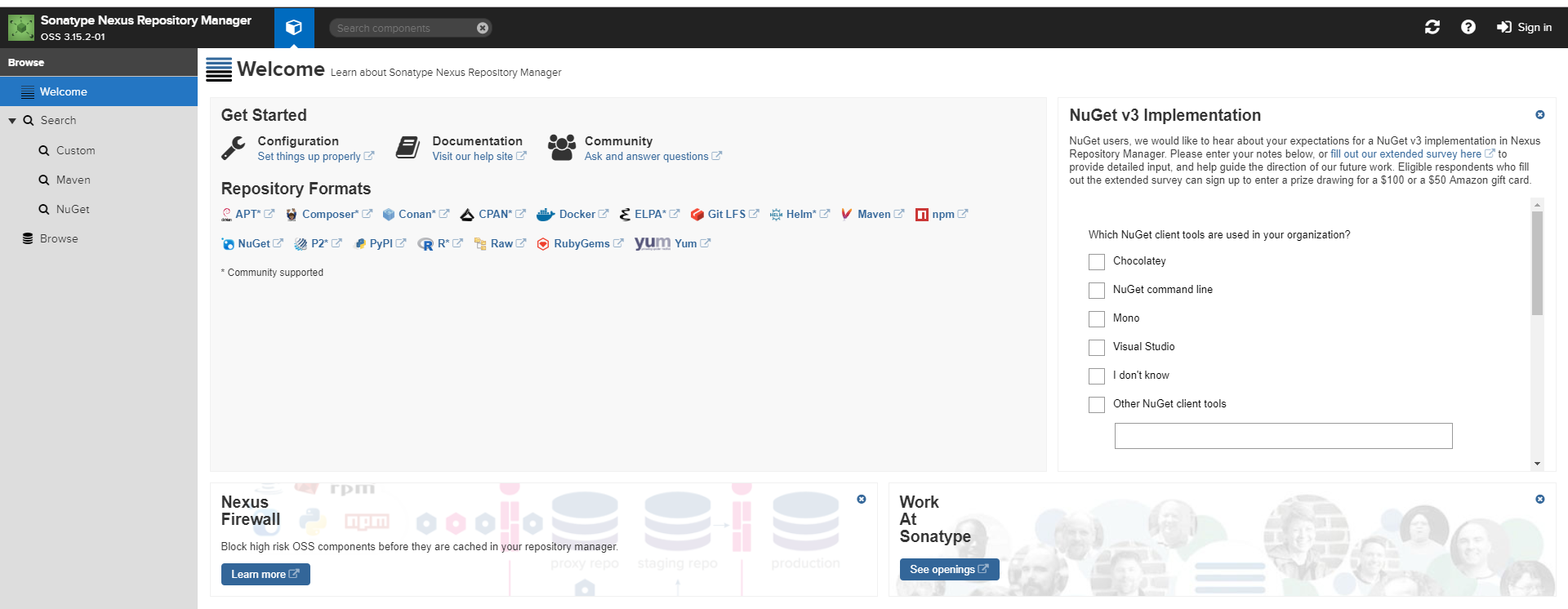 可以发现,右上角有一个 "sign in" 的按钮,说明我们需要登录,此时的界面只是一些预览的功能,这是nexus默认给匿名用户开放的权限。