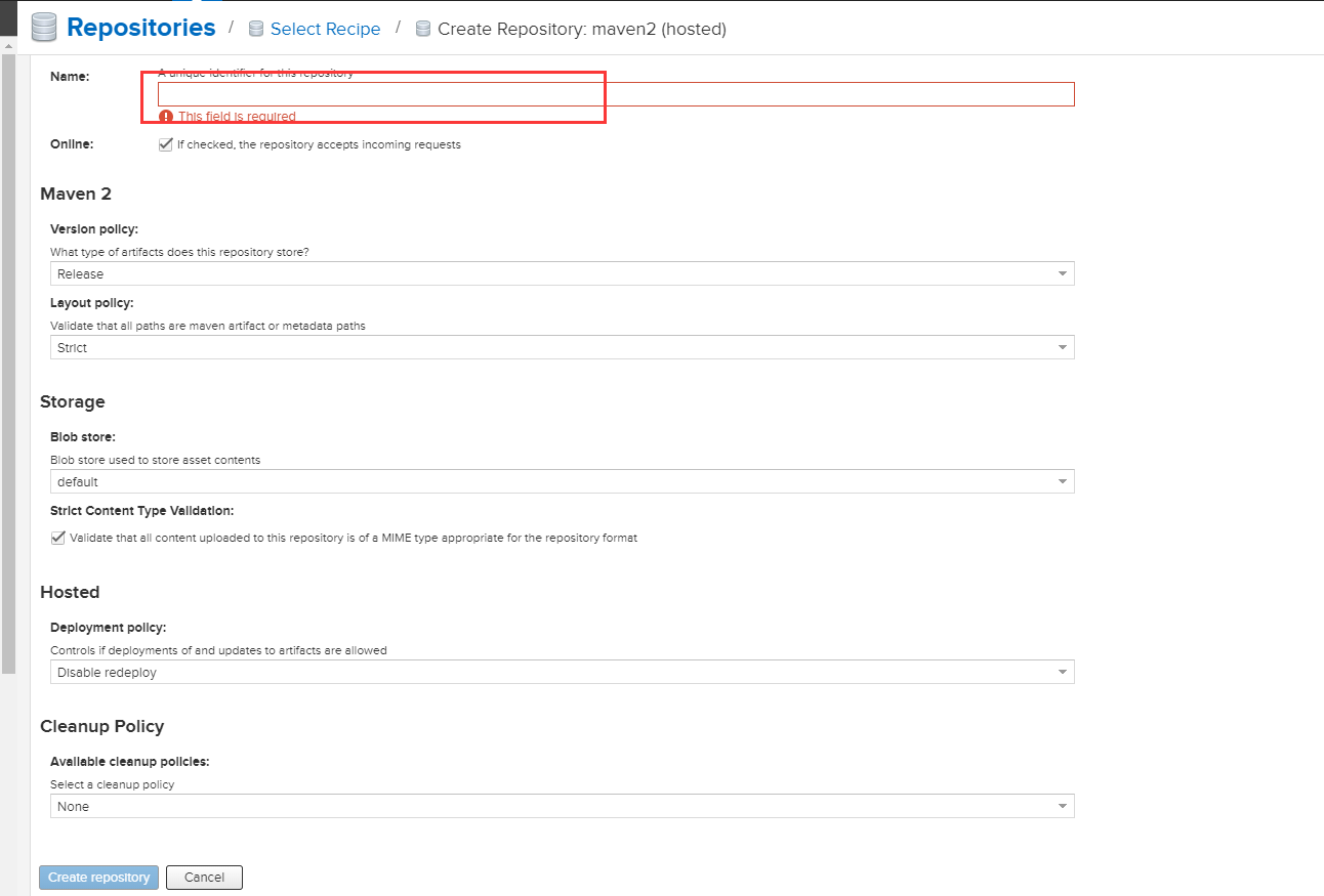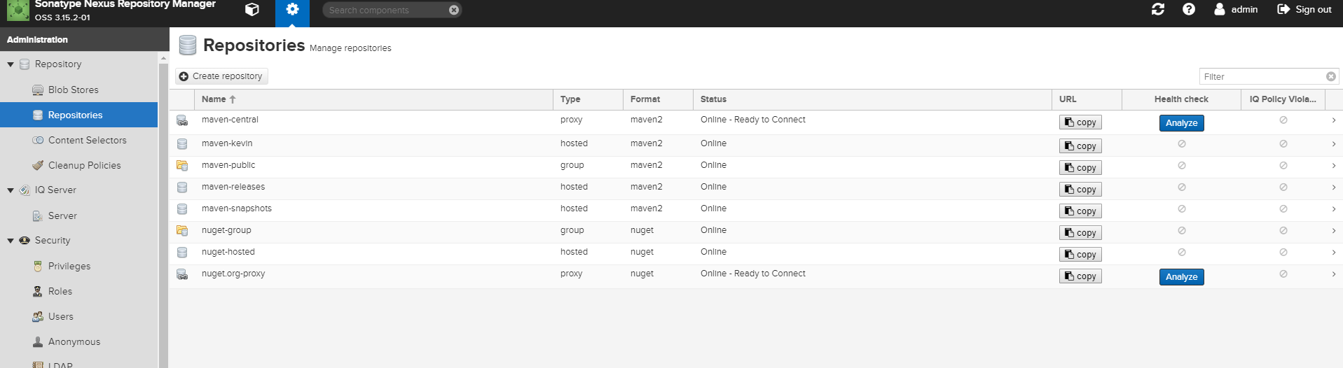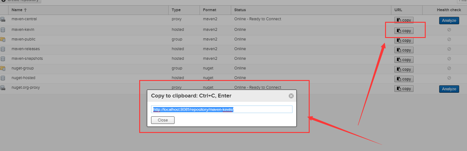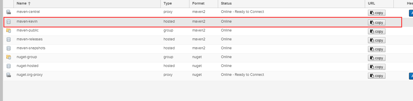 填写属于自己的maven库名称,注意,这个名称后面一直都会用到,所以不要取的很随意。笔者这里取名为“maven-kevin”,其他全部默认。点击创建按钮,完成创建。