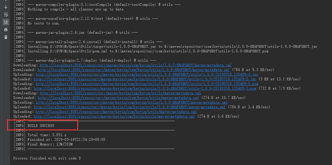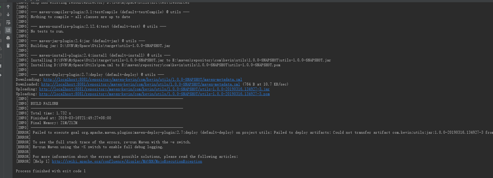 Failed to execute goal org.apache.maven.plugins:maven-deploy-plugin:2.7:deploy (default-deploy) on project utils: Failed to deploy artifacts: Could not transfer artifact com.kevin:utils:jar:1.0.0-20190316.134927-3 from/to maven-kevin (http://localhost:8081/repository/maven-kevin/): Failed to transfer file: http://localhost:8081/repository/maven-kevin/com/kevin/utils/1.0.0-SNAPSHOT/utils-1.0.0-20190316.134927-3.jar. Return code is: 401, ReasonPhrase: Unauthorized. -> [Help 1]