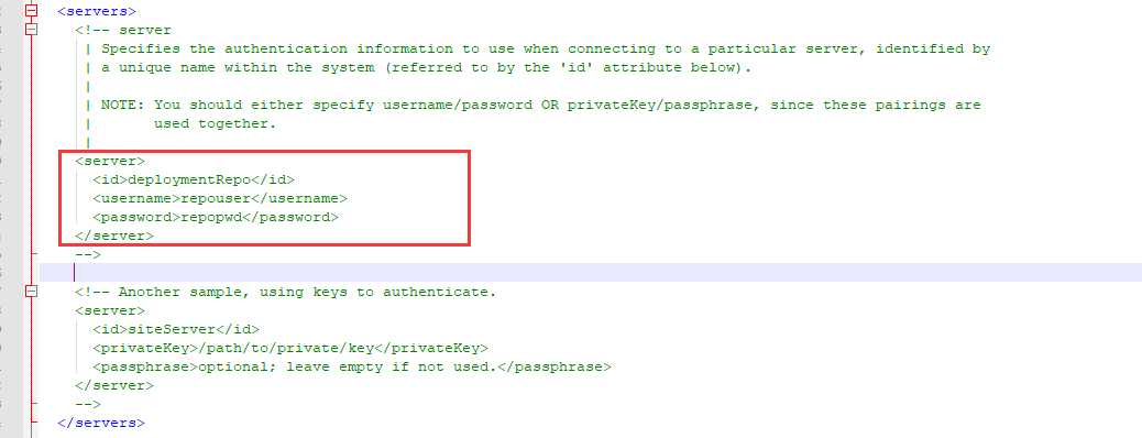 找到如上图标记的内容,这里就是需要配置的账号和密码,修改对应的为自己maven登录账号密码,再次进行deploy,