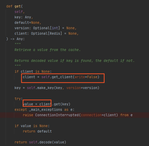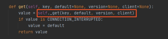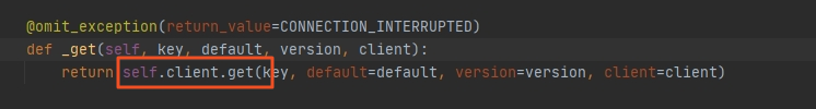 其中client对象是django_redis.client.DefaultClient,这个也是setting中指定的。我们实际调用的是django_redis.client.DefaultClient对象的get方法,