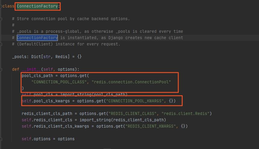 在初始化ConnectionFactory对象时,我们使用了setting中的 "CONNECTION_POOL_CLASS": "redis.BlockingConnectionPool"指定连接类型