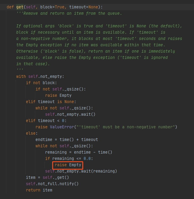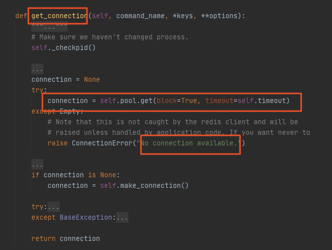redis client对象实际为redis.client.Redis对象,get方法实际上就是执行execute_command函数,但在执行前需要从连接池队列中获取连接,在获取连接的时候,采用协程阻塞的方法从队列中获取连接对象,连接队列是一个Lifo队列,在执行reset.put_nowait过程中队列里面放了50个None对象中,所以获取连接的时候如果获取的是None对象,就调用make_connection函数创建redis连接。然后使用连接执行get命令,使用结束后调用release方法重新将None对象放入连接队列中,如果连接队列过小,获取连接对象的时间超过timeout(20 s),self.pool.get就会抛出empty异常,外面捕获到empt异常后再往外抛No connection avaiable异常,所以并发如果大于50时容易产生此异常。