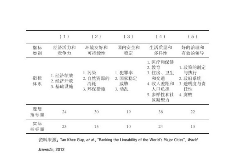 宜居城市的定义:生活方式越是与人性一致,这样的城市才越宜居。追求物质富足仍然是人性的首要因素,然后才是对自然环境、安全、社会和文化条件,以及公共治理的追求。经济活力和竞争力、环境友好和可持续性、国内安全和稳定、生活质量和多样性、好的治理和有效的领导五个大类。