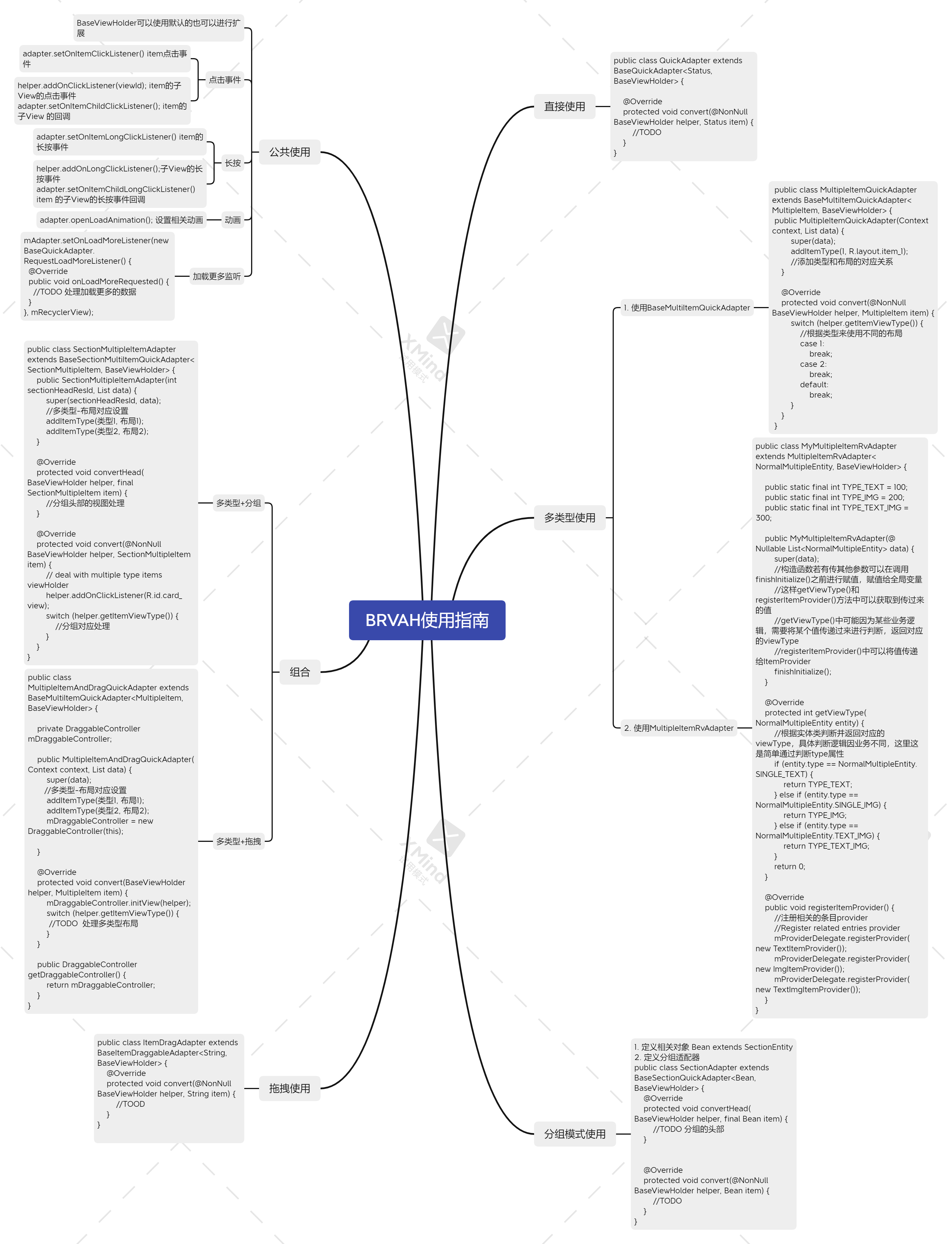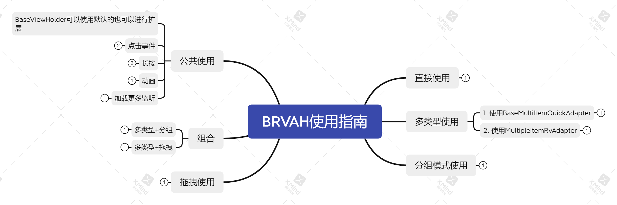 随着项目中使用到的RecyclerView越来越多,需要编写的样板代码让人厌烦。因为大家都有这种感觉,所以开源库也就成为了大家的选择,而选择开源库的时候,BRVAH是我在项目中经常使用的。特此梳理一下BRVAH的思维导图。