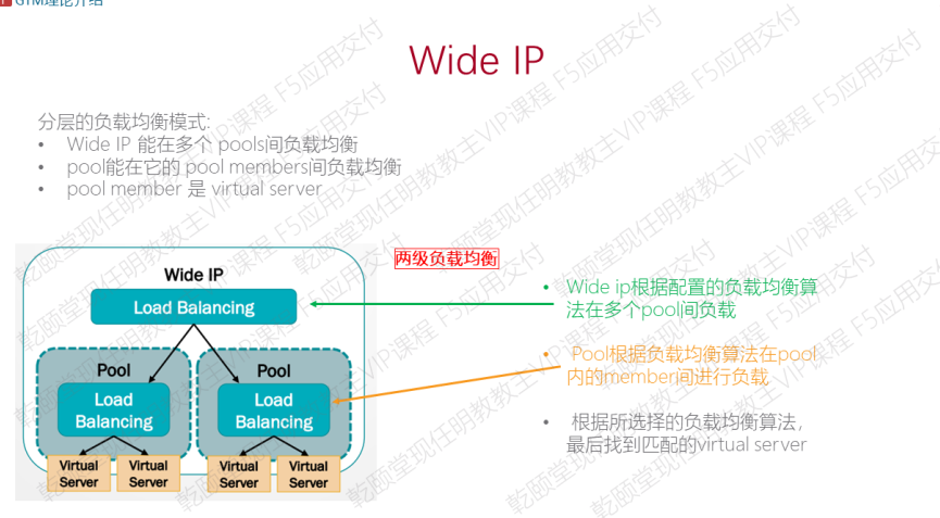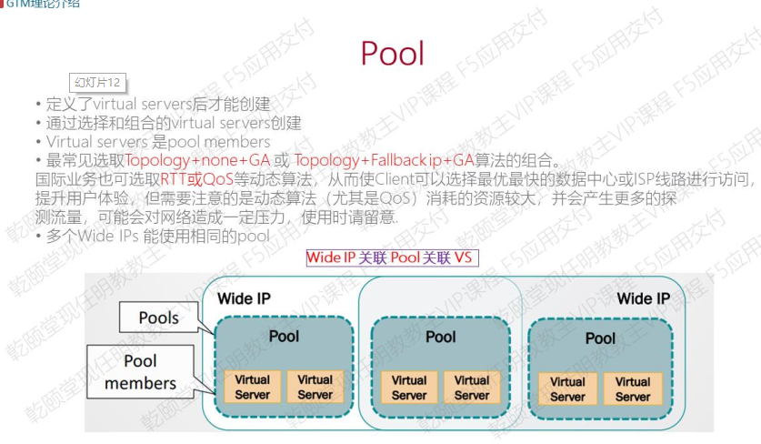 Pool:用来组织VS,是wideip的配置要素,同一VS可以同时属于多个pool;(域名下来并不是直接对VS IP,而是pool)