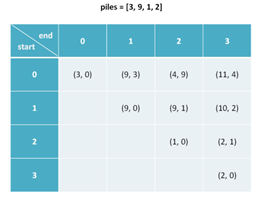 对于这个问题的每个状态,可以做的选择有两个:选择最左边的那堆⽯头,或者选择最右边的那堆⽯头。 我们可以这样穷举所有状态: