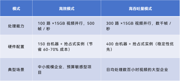 方案提供两种模式,适合不同的吞吐量需求和预算。 高效模式可以并行处理多达 100 个 15 GB 视频,在多达 150 台机器上每秒提供约 500 帧。这种方法利用了抢占式实例(Spot Instances)以提高成本效益。