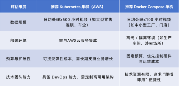 Kubernetes 方案适合日均处理数百小时视频、需弹性扩展的大规模场景;Docker Compose 方案则适用于小型部署或离线环境。企业可根据数据量、预算及部署环境选择,确保在保护敏感信息的同时满足性能需求。