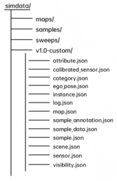 SimData 数据集在结构设计上与 nuScenes 完全保持一致。对于已经熟悉 nuScenes 的开发者而言,无需额外的适配或学习成本,即可快速上手 SimData 的使用与解析。 下图展示了 SimData 数据集的整体目录结构,nuScenes 同样遵循这一组织形式,以实现无缝兼容与工具级互通。