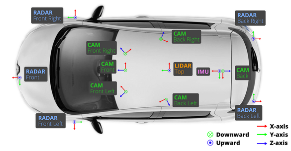 因此,用户在使用 SimData 时,无需额外关注坐标差异,其数据解析与开发体验与 nuScenes 保持一致。 下图展示了 nuScenes 中各传感器的典型布局及其坐标系定义。