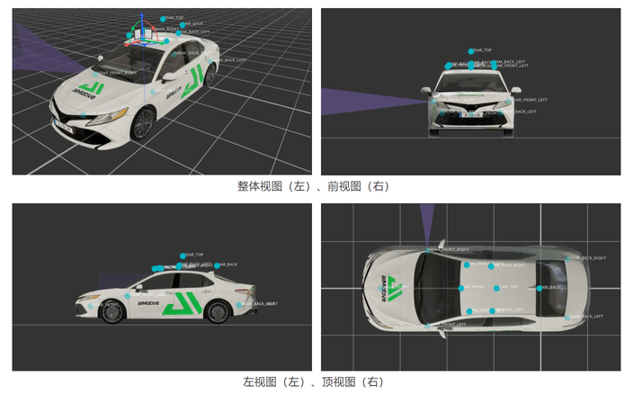 在 aiSim 仿真平台中,我们严格复现了 nuScenes 数据集的传感器布局,以确保数据结构和多模态同步特性的一致性。 仿真车辆共配置了 6 路环视相机、5 个雷达(Radar)、1 个激光雷达(LiDAR)、1 个惯性测量单元(IMU)以及 1 个定位系统(GPS)。 其中,相机与雷达的采样频率均为 40 Hz,激光雷达的采样频率为 80 Hz,能够满足高时序精度的多传感器同步采集需求。 各传感器的空间布设与朝向如下图所示。
