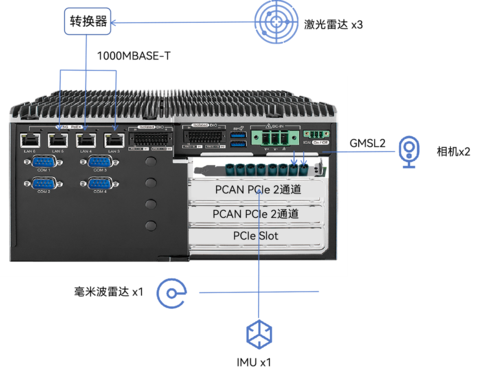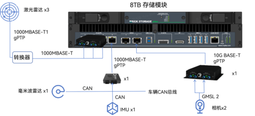 (1)核心算力与存储: 使用 BRICKplus 工控机,搭载8TB大容量BRICK STORAGE存储模块。设备支持宽温运行,抗震等级高,专为车载环境设计。