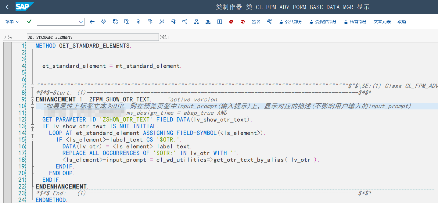 在 类CL_FPM_ADV_FORM_BASE_DATA_MGR,方法GET_STANDARD_ELEMENTS中,增加增强逻辑,源码如下: