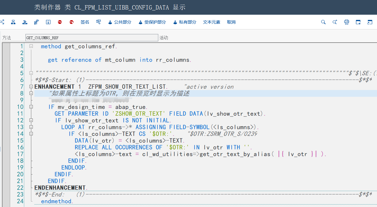 在 类CL_FPM_LIST_UIBB_CONFIG_DATA,方法GET_COLUMNS_REF中,增加增强逻辑,源码如下: