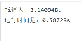 1 from math import sqrt 2 from random import random 3 from time import perf_counter 4 5 DARTS =1000000 6 hits =0.0 7 start = perf_counter() 8 for i in range(1,DARTS+1): 9 10 x,y =random(),random() 11 dist =sqrt(x**2+y**2) 12 if dist <=1.0: 13 hits =hits+1 14 pi = 4*(hits/DARTS) 15 print("Pi值为:{}.".format(pi)) 16 print("运行时间是:{:.5f}s".format(perf_counter()-start))