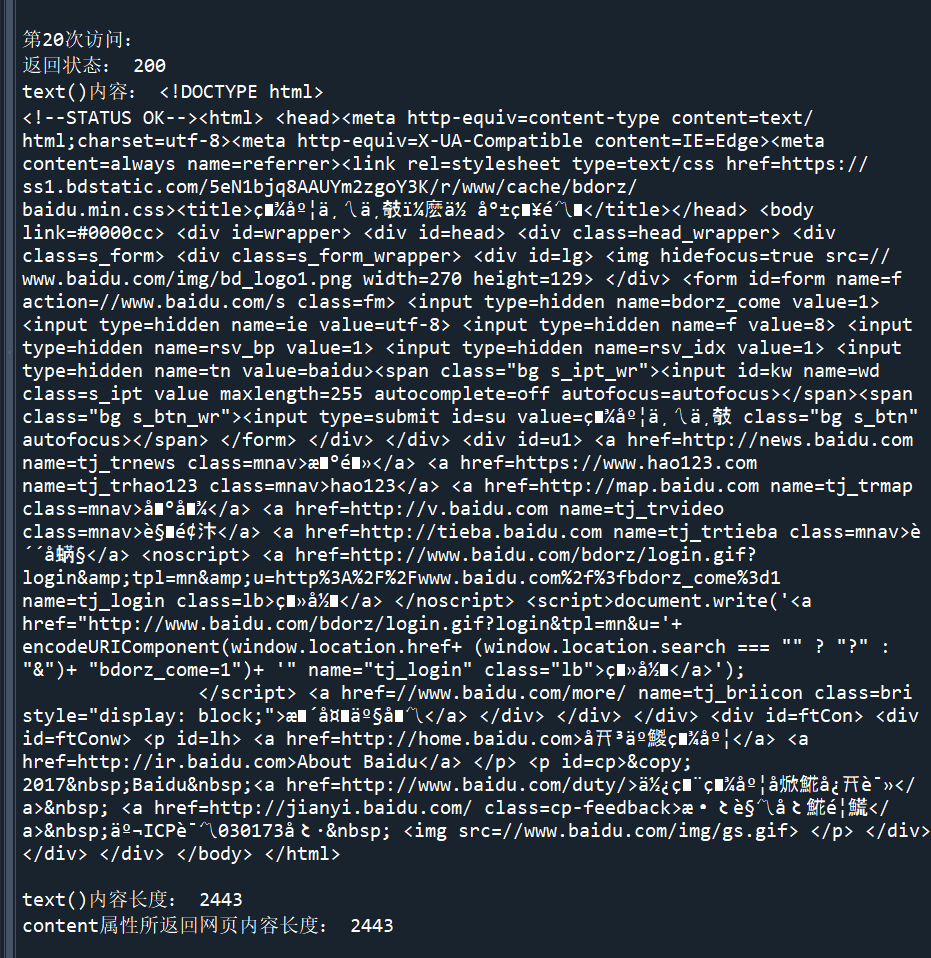 1 import requests 2 3 url = "https://www.baidu.com/" 4 5 for i in range(20): 6 response = requests.get(url) 7 print("第{}次访问:".format(i + 1)) 8 print("返回状态:", response.status_code) 9 print("text()内容:", response.text) 10 print("text()内容长度:", len(response.text)) 11 print("content属性所返回网页内容长度:", len(response.content)) 12 print("")