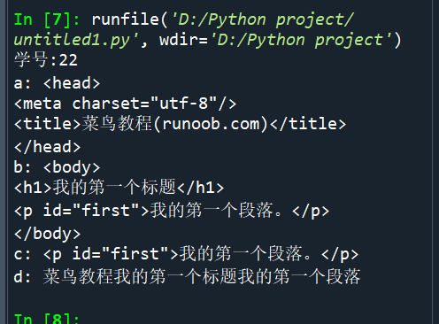 1 from bs4 import BeautifulSoup 2 3 html_doc = """ 4 <!DOCTYPE html> 5 <html> 6 <head> 7 <meta charset="utf-8"> 8 <title>菜鸟教程(runoob.com)</title> 9 </head> 10 <body> 11 <h1>我的第一个标题</h1> 12 <p id="first">我的第一个段落。</p> 13 </body> 14 <table border="1"> 15 <tr> 16 <td>row 1, cell 1</td> 17 <td>row 1, cell 2</td> 18 </tr> 19 <tr> 20 <td>row 2, cell 1</td> 21 <td>row 2, cell 2</td> 22 </tr> 23 </table> 24 </html> 25 """ 26 27 print("学号:22") 28 soup = BeautifulSoup(html_doc, 'html.parser') 29 print("a:", soup.head) 30 print("b:", soup.body) 31 first_element = soup.find(id="first") 32 print("c:", first_element) 33 chinese_characters = "".join([char for char in html_doc if '\u4e00' <= char <= '\u9fff']) 34 print("d:", chinese_characters)