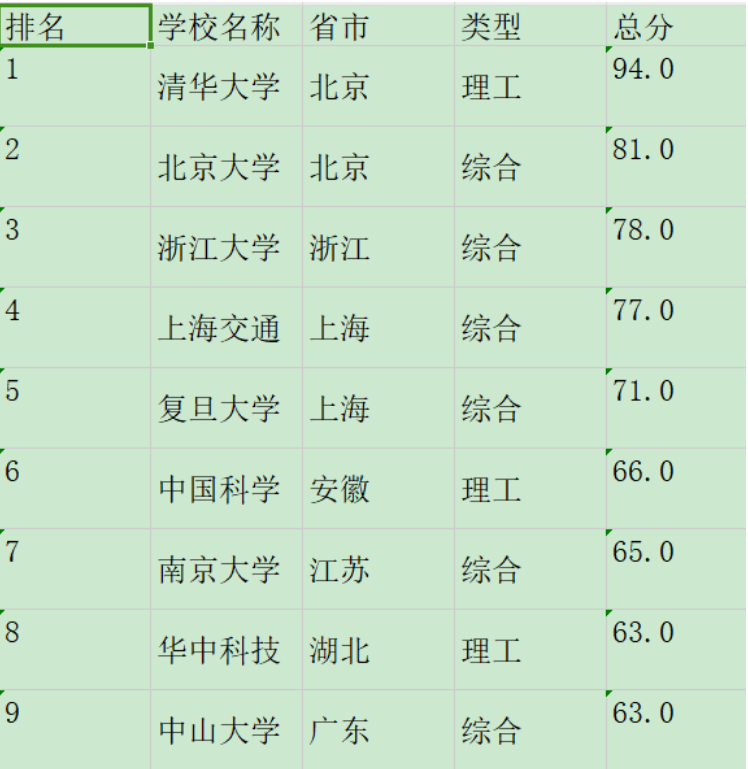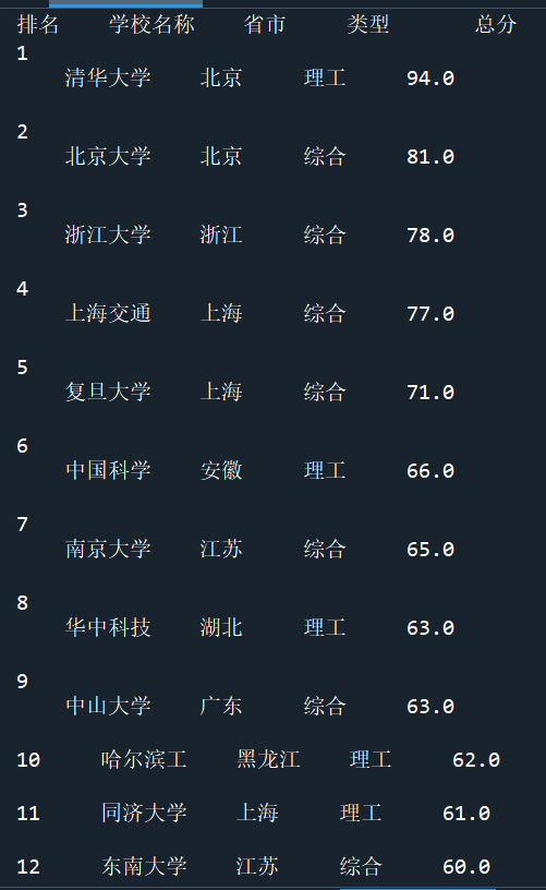 1 # e23.1CrawUnivRanking.py 2 import re 3 import pandas as pd 4 import requests 5 from bs4 import BeautifulSoup 6 7 allUniv = [] #储存 8 9 10 def getHTMLtext(url): #获取指定URL的HTML文本,设置超时时间为30秒 11 try: 12 r = requests.get(url, timeout=30) 13 r.raise_for_status() 14 r.encoding = 'utf-8' 15 return r.text 16 except: 17 return "" 18 19 20 def fillUnivList(soup): 21 soup.encode('utf-8') 22 data = soup.find_all('tr') #遍历解析后的HTML中的所有表格行 23 list1=[] 24 for tr in data: 25 ltd = tr.find_all('td') #对于每一行,提取其中的所有单元格(td标签) 26 if len(ltd) == 0: 27 continue 28 singleUniv = [] #如果单元格数量不为0,用于存储当前行的大学排名信息 29 for td in ltd: 30 temp=re.findall('[\u4e00-\u9fff]+' ,str(td)) #使用正则表达式提取其中的中文字符 31 if td.string!=None and td.string!="[]": 32 singleUniv.append(td.string) 33 if temp!=[]: 34 if type(temp)==list: 35 str1='' 36 for i in temp: 37 str1+=i 38 singleUniv.append(str1) 39 allUniv.append(singleUniv) 40 return allUniv 41 42 43 def printUnivList(num): 44 print("{:^4}{:^10}{:^5}{:^8}{:^10}".format("排名", "学校名称", "省市", "类型", "总分")) #表头 45 for i in range(num): 46 u = allUniv[i] 47 u[0]=u[0][29:31] 48 u[1]=u[1][:4] 49 u[4]=u[4][25:31] 50 print("{:^5}{:^10}{:^5}{:^8}{:^10}".format(u[0], u[1], u[2], u[3], u[4])) 51 def main(flag): 52 url = 'https://www.shanghairanking.cn/rankings/bcur/201711' 53 html = getHTMLtext(url) 54 soup = BeautifulSoup(html, "html.parser") 55 list1=fillUnivList(soup) 56 if flag==0: 57 printUnivList(30) #爬取多少行 58 else: 59 return list1 60 # 定义一个函数,将里面的嵌套列表的第一个元素取出 61 def combination(list1,count): 62 list2=[] 63 for i in list1: 64 list2.append(i[count]) 65 return list2 66 main(0) 67 list1=main(1) 68 # 定义一个函数,处理一下获取到的数据 69 def deal_data(list1): 70 list_1=combination(list1,0) 71 list_2=combination(list1,1) 72 list_3=combination(list1,2) 73 list_4=combination(list1,3) 74 list_5=combination(list1,4) 75 data = pd.DataFrame({ 76 "排名": list_1, 77 "学校名称": list_2, 78 '省市': list_3, 79 '类型': list_4, 80 '总分': list_5 81 }) 82 return data 83 data=deal_data(list1) 84 data.to_csv('University_grade.csv',index=False)