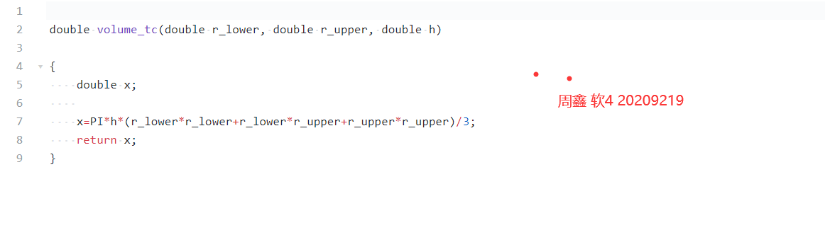 函数参数:主调函数 int main(void);被调函数 double volume_tc(double r_lower, double r_upper, double h);double类型;实参 double x,形参 double r_lower,double r_upper,double h。;