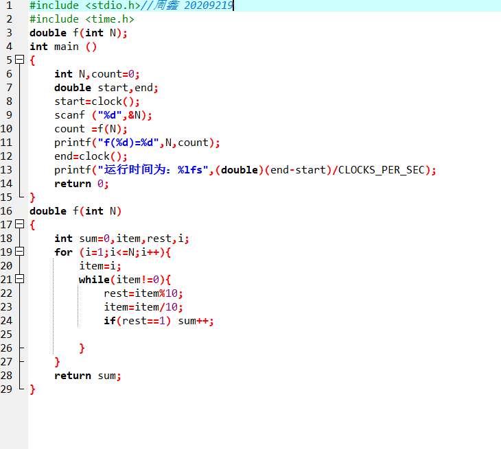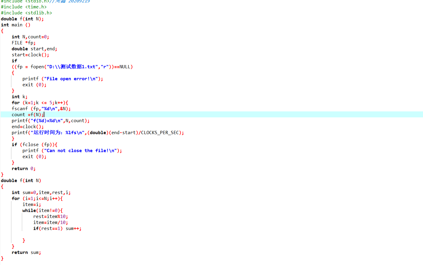 解题思路:先调用f(int N)这个函数,再定义这个函数,先算个每一项item的“1”的个数,在算出所有整数的“1”的个数。