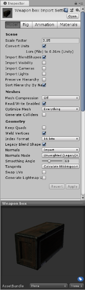 4、制作箱子预制物。如果进入后拖入的模型原始大小不合适,自己在原模型处修改大小Scale Factor,然后添加刚体 rigidbody和碰撞box Colllider,改名为Box,新建文件夹,将预制体拖入,调节BoxManager的X坐标轴
