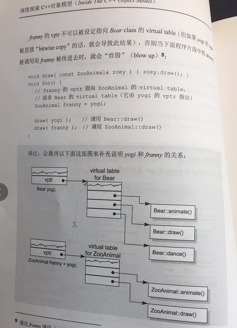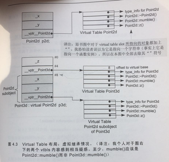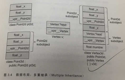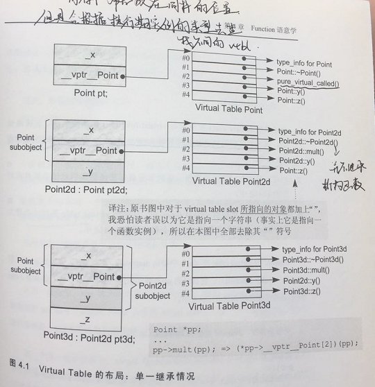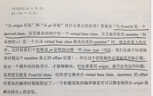 class Point2D { public : Point2D(int x0, int y0) { x = x0; y = y0; } virtual int distance(int x0, int y0) { return (x - x0) ^ 2 + (y - y0) ^ 2; } virtual const char * Name() { return "Point2D"; } private: int x; int y; static int c; }; int Point2D::c = 0; class Point3D :public virtual Point2D { public: Point3D(int x0, int y0, int z0): Point2D(x0,y0) { z = z0; } virtual int distance(int x0, int y0, int z0) { return Point2D::distance(x0, y0) + (z - z0) ^ 2; } virtual const char * Name() { return "Point3D"; } private: int z; }; int main() { Point3D st3D(3, 4, 5); Point2D *p2D; p2D = &st3D; printf("Call Name through 2d base pointer:%s\n", p2D->Name());
