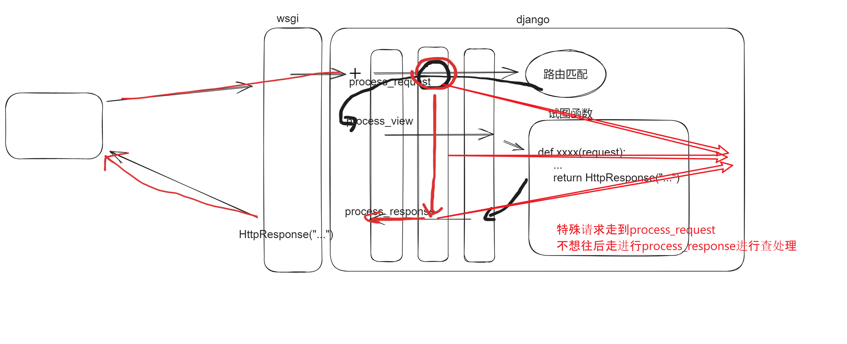 2. process_view判断不向下进行,交给process_response处理