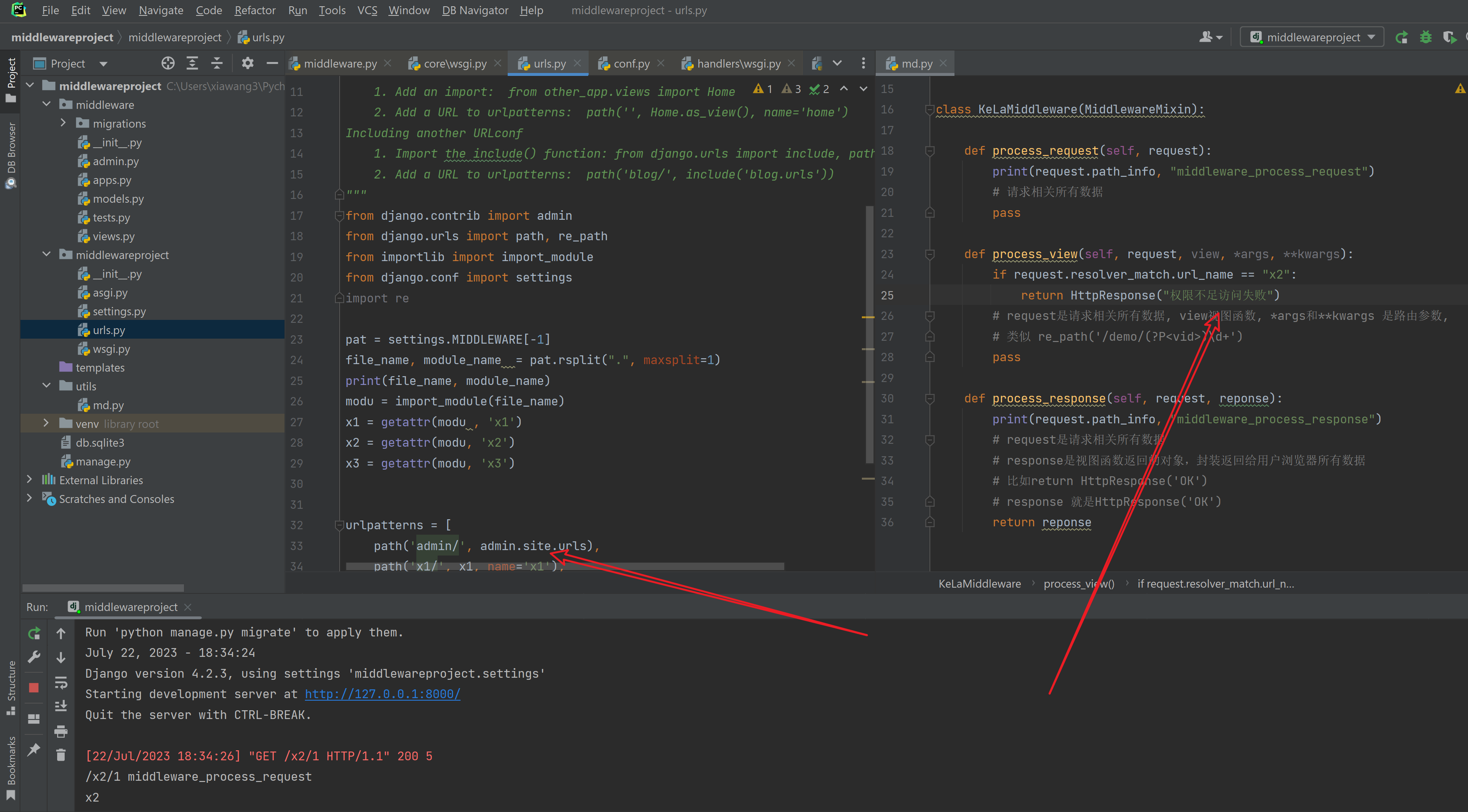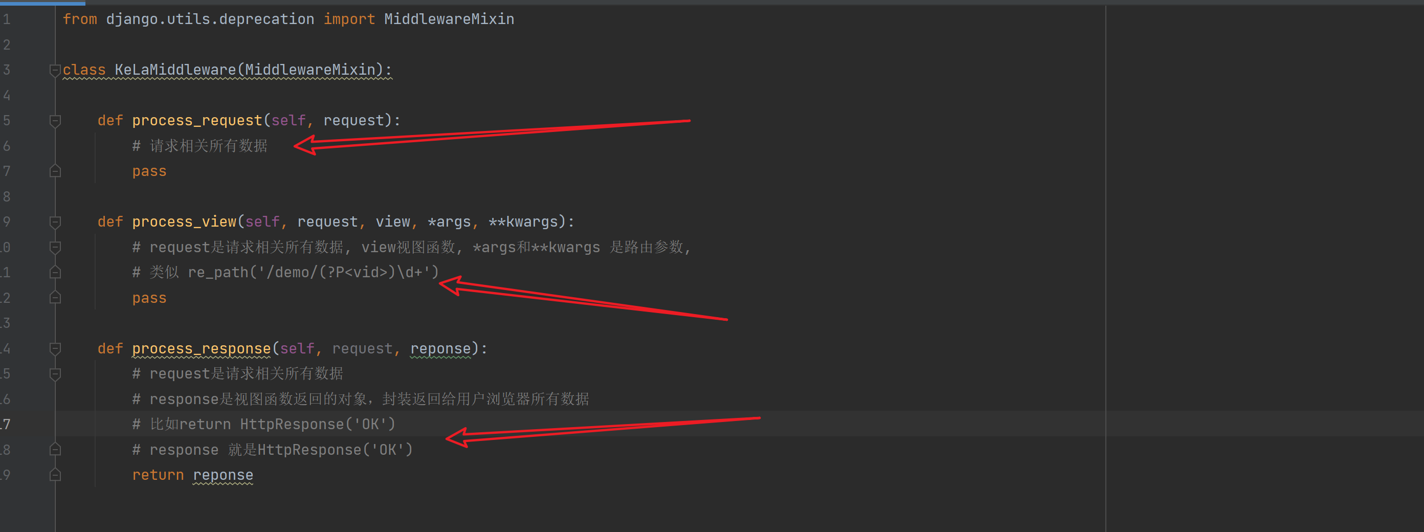 1. 编写类 在类中定义process_request, process_view, process_response