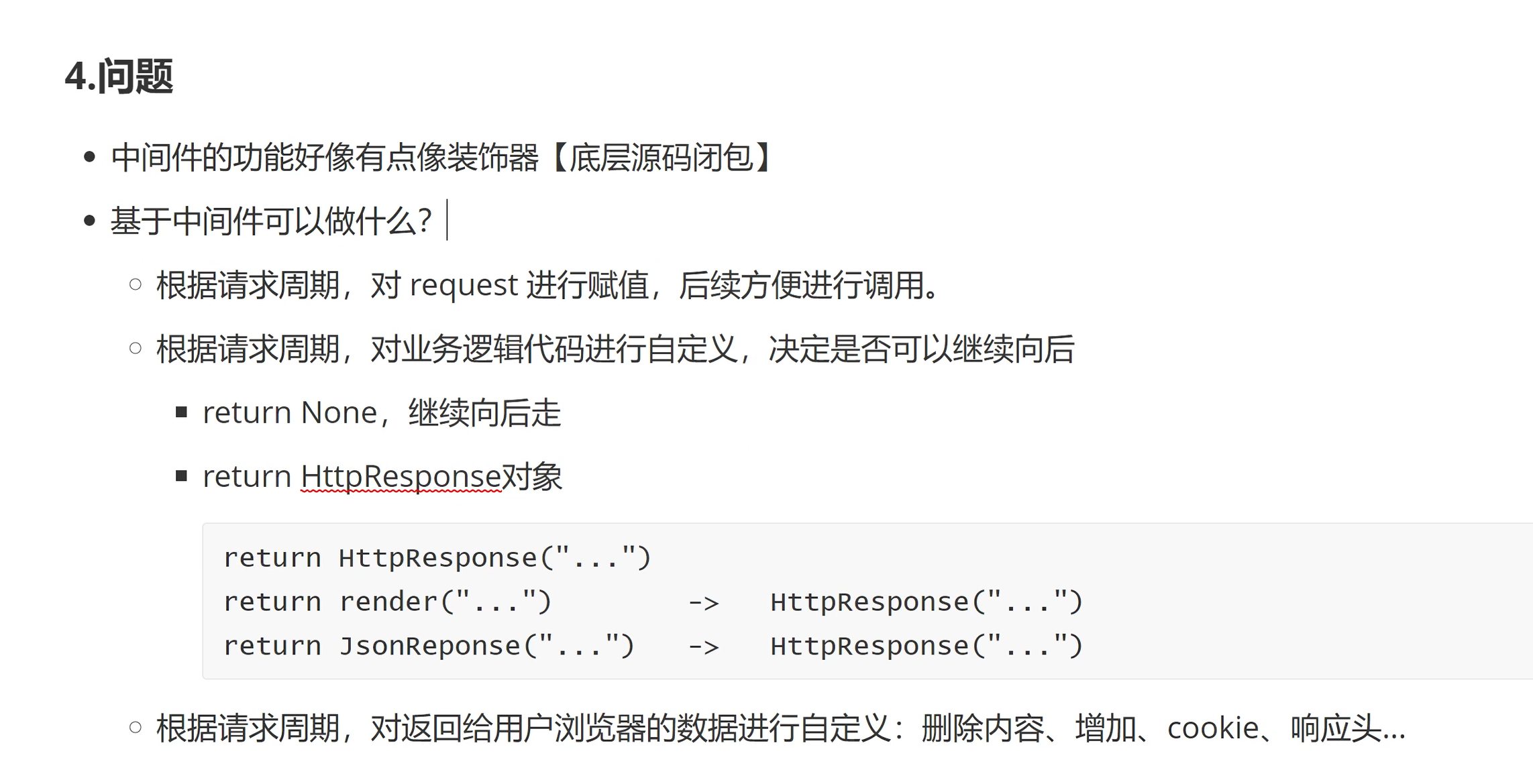比如在做用户验证或者用户登陆情况下,可以在process_request,和process_view里验证如果失败