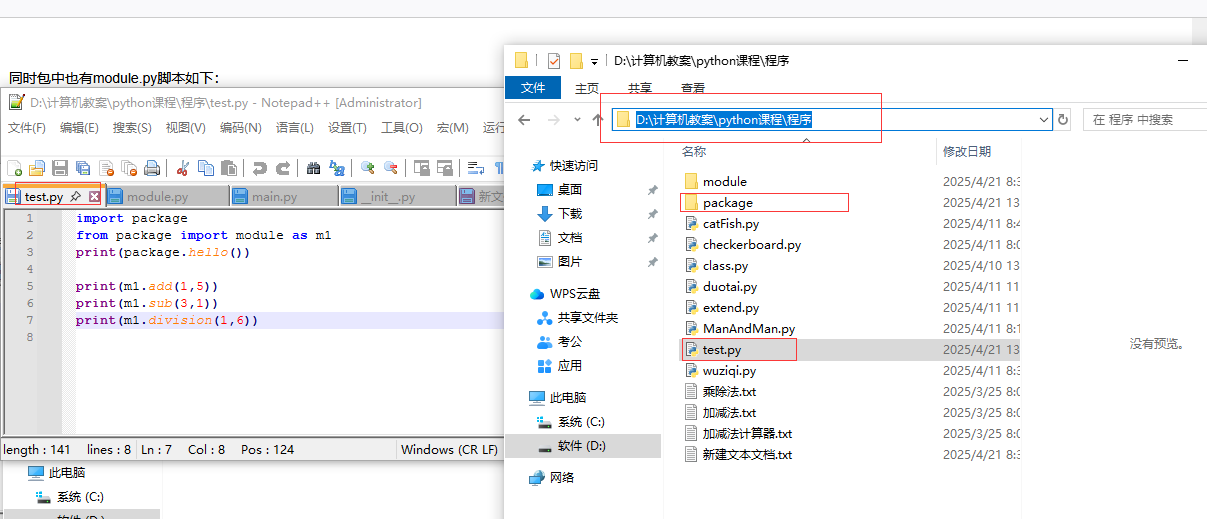 2,在package同级目录下新建test.py脚本,在test.py中引入包就可以调用包中方法如下: