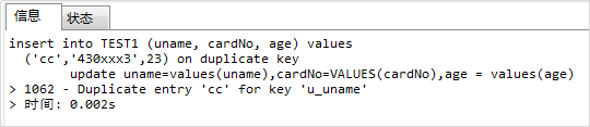 -- 4.执行第四次:(与第一条记录uname,第二条记录cardNo两个唯一索引冲突,执行报错) insert into TEST1 (uname, cardNo, age) values ('cc','430xxx3',23) on duplicate key update uname=values(uname),cardNo=VALUES(cardNo),age = values(age);