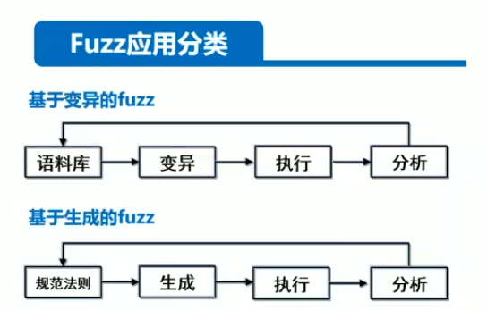 安全漏洞对于软件的测试,需要找到它的输入口,然后构造大量的随机输入文件,企图使软件执行异常的程序执行路径,以找到崩溃点。在分类方面,可以把Fuzz大概分为两类,基于变异的Fuzz和基于生成的Fuzz,在基于变异的Fuzz,比较经典的例子是AFL,是通过一个语料库的提供,提供一些现有的输入,然后通过这个Fuzz对输入进行变异,再输入到软件中进行执行。基于生成是提供一些生存法则来不断地生成随机的一些测试用例,无论是哪一种,他们在执行之后都需要对一个程序的执行结果进行分析,以反馈到下一步的一个执行策略。