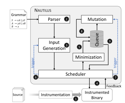 第一步是使用检测工具1编译目标应用程序的源代码,以便提供覆盖率信息反馈。之后,启动Fuzzer解析用户提供的语法2,再生成少量随机初始输入3,并传递给调度器,接着NAUTILUS通过执行检测的二进制文件4测试新生成的输入是否触发任何新的覆盖,如果触发,NAUTILUS使用语法将其最小化,添加到队列5中,调度器会触发现有输入的变异6或派生一个新的输入7。对于队列中的输入,应用基于语法的变异。变异之后,输入被添加到队列8,在分析运行9中使用。