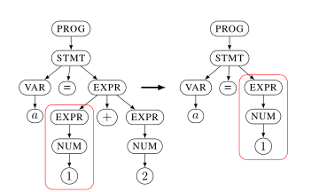 之后进行一个最小化的操作,是抽象语法树上一个变异策略的其中一部分,有两种,一种是子树最小化,子树有两种形式,把它替换成一个最小的子树,有一个递归结构,逐步自底向上不断去缩小递归的规模,在替换之后我们就生成了一个新的输入法,放到程序界面进行执行,检查的覆盖率,如果覆盖率不变,说明这两个结构是一样的,表明用这个小子树也是一样的效果,效率会高很多,就保留改变的新输入,但是如果覆盖率发生了变化,那说明对子树的这个操作破坏了文件结构与程序执行路径,现有的程序执行路径那么就不能改,就要保留改动之前的输入,在队列里面去找下一个进行最小化。
