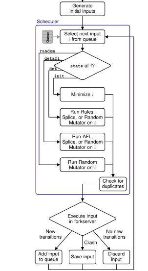 在生成一些初始输入之后,调度器决定接下来应该尝试哪个输入:(i)用某个特定的变异对现有输入进行变异,或者(ii)从头生成一个新的输入。