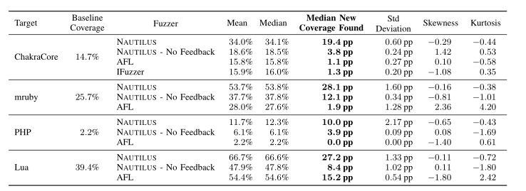 在四个应用程序上测试NAUTILUS,均发现漏洞,也与其他先进的Fuzzer进行对比,回答了六个问题: