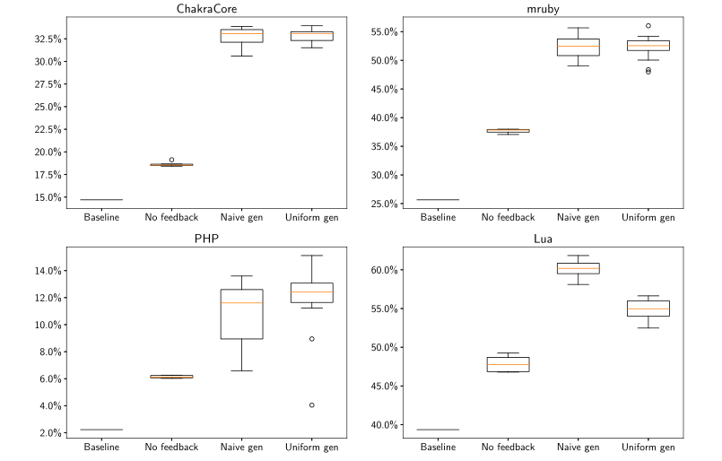 将语法模糊与反馈结合起来可以进一步改善模糊过程。通常,将反馈添加到基于语法的模糊测试中,对于我们的四个目标(mruby,PHP,Lua和ChakraCore),代码覆盖率至少增加两倍。与不基于语法的工具(例如AFL)仅使用反馈驱动的模糊测试进行比较时,对种子语料库的改进更为明显:在许多情况下,发现的新覆盖率是其十倍以上。结果表明,正是语法和工具的结合才导致性能的显著提高。这种组合使模糊测试器可以自动识别并重组语义上有效的代码片段,从而大大提高性能。
