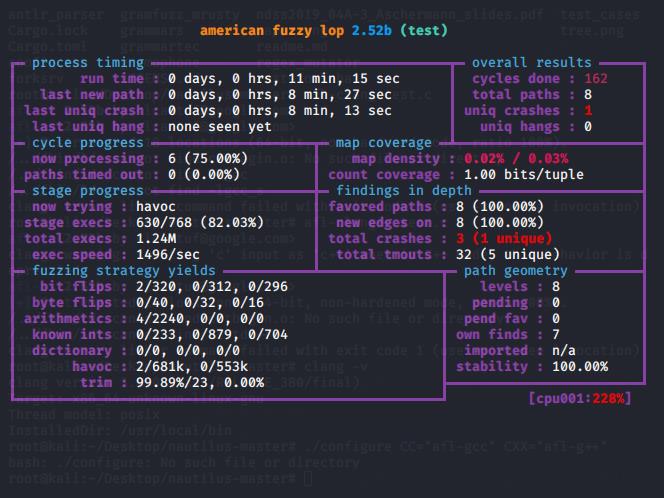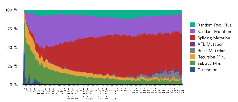 random:只有随机变异、随机递归变异和剪接变异应用于此条目。与AFL相反,在继续下一个输入之前,不会完成每一个阶段。相反,在继续处理下一个输入之前,NAUTILUS只在每个输入上花费很短的时间。因此,可以快速地探索那些可能产生新覆盖率的输入,这允许实现类似AFLFast的效果。