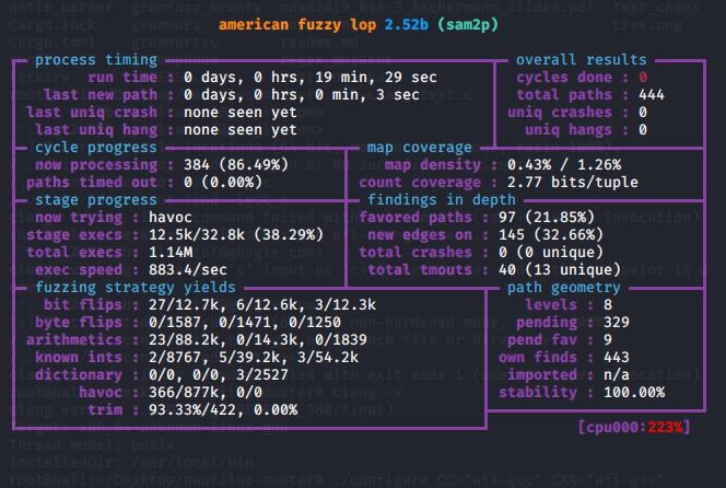 第三步原论文使用的是rust环境,不知为何配置rust环境一直失败,于是换用了AFL对测试程序进行fuzzing,并使用了网上的程序sam2p,一同fuzzing,测试程序跑出了crash,sam2p为检测出crash,参考了博客