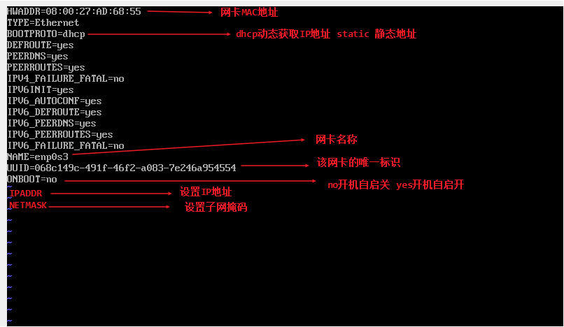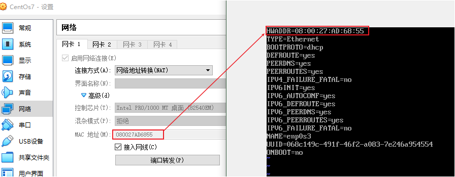 注意:网卡1的MAC地址和ifcfg-enp0s3的HWADDR对应,网卡2的MAC地址和ifcfg-enp0s8的HWADDR对应