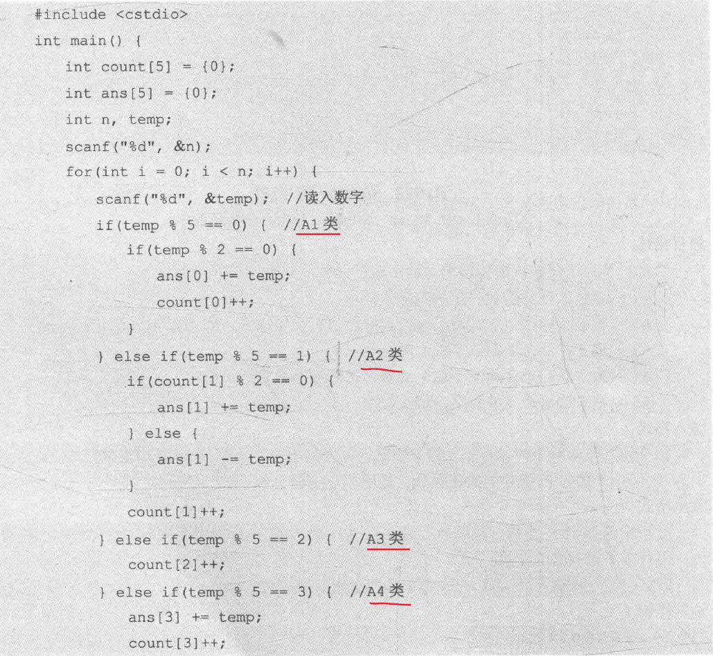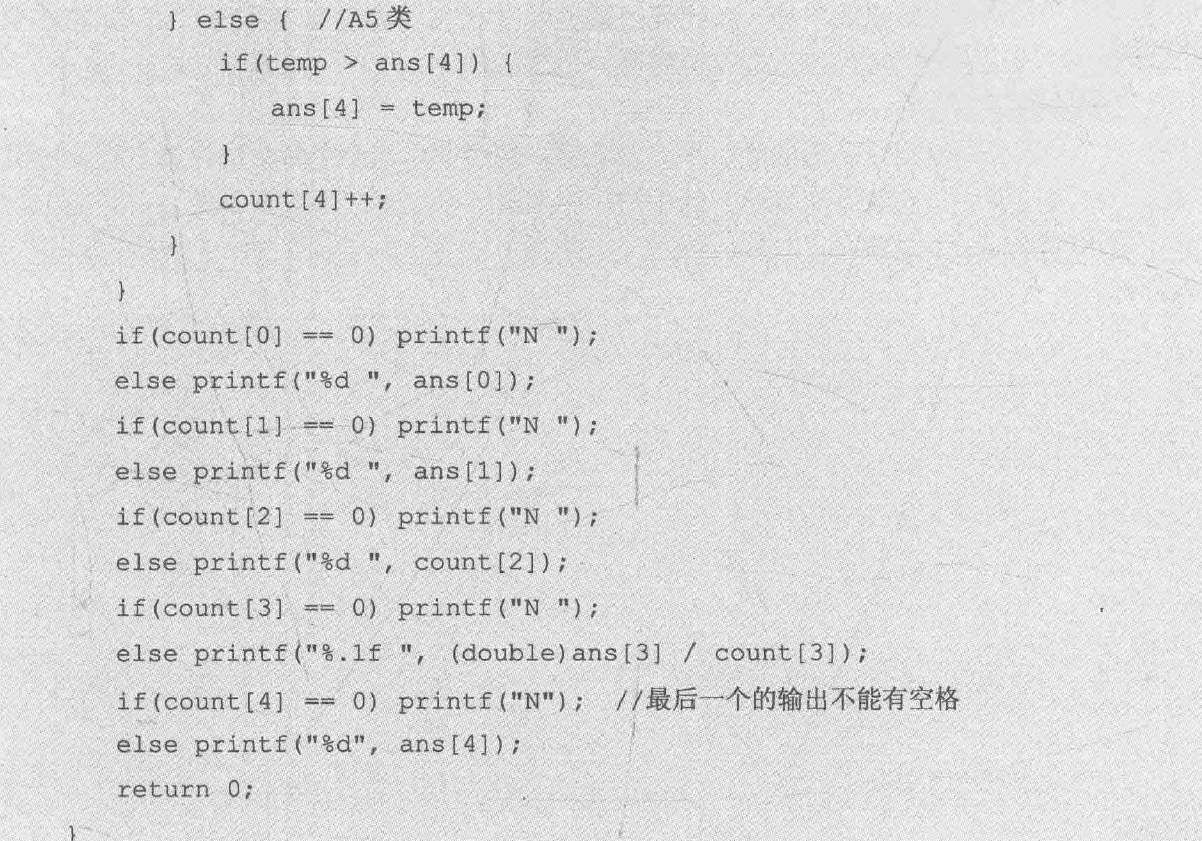 counts[5]存放五类数据的个数,用ans[5]存放输出结果,不用像自己一样定义五个变量。