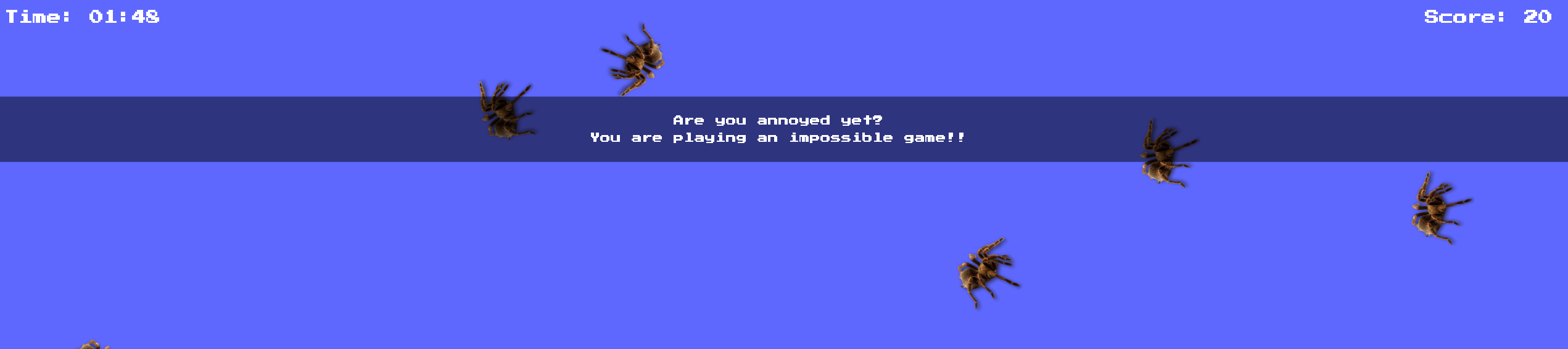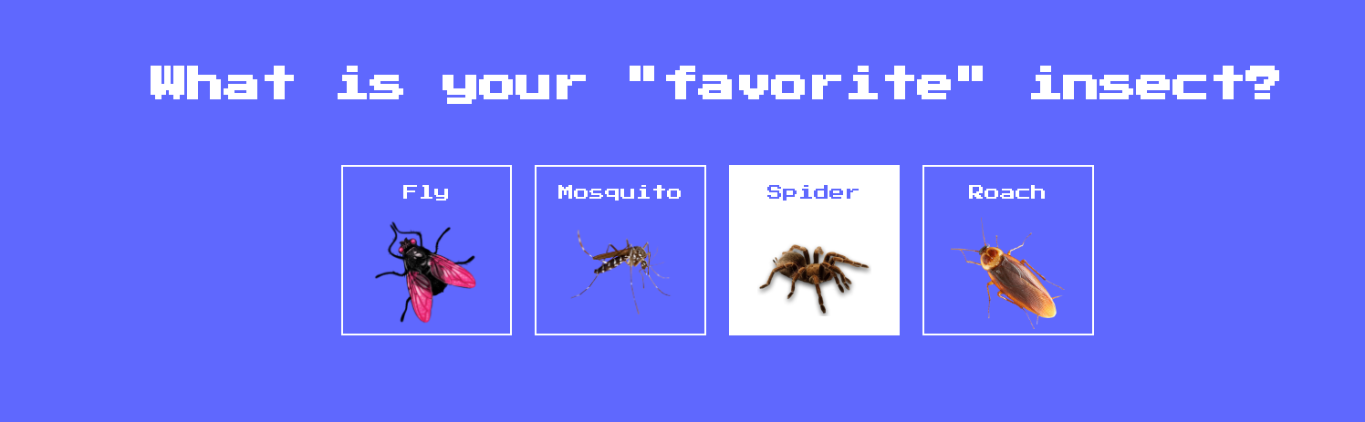 <!DOCTYPE html> <html lang="en"> <head> <meta charset="UTF-8" /> <meta name="viewport" content="width=device-width, initial-scale=1.0" /> <link rel="stylesheet" href="style.css" /> <title>Catch The Insect</title> </head> <body> <div class="screen"> <h1>Catch The Insect</h1> <button class="btn" id="start-btn">Play Game</button> </div> <div class="screen"> <h1>What is your "favorite" insect?</h1> <ul class="insects-list"> <li> <button class="choose-insect-btn"> <p>Fly</p> <img src="http://pngimg.com/uploads/fly/fly_PNG3946.png" alt="fly"> </button> </li> <li> <button class="choose-insect-btn"> <p>Mosquito</p> <img src="http://pngimg.com/uploads/mosquito/mosquito_PNG18175.png" alt="mosquito" /> </button> </li> <li> <button class="choose-insect-btn"> <p>Spider</p> <img src="http://pngimg.com/uploads/spider/spider_PNG12.png" alt="spider" /> </button> </li> <li> <button class="choose-insect-btn"> <p>Roach</p> <img src="http://pngimg.com/uploads/roach/roach_PNG12163.png" alt="roach" /> </button> </li> </ul> </div> <div class="screen game-container" id="game-container"> <h3 id="time" class="time">Time: 00:00</h3> <h3 id="score" class="score">Score: 0</h3> <h5 id="message" class="message"> Are you annoyed yet? <br> You are playing an impossible game!! </h5> </div> <script src="script.js"></script> </body> </html>