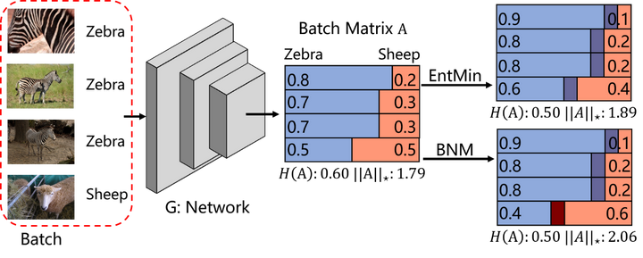 比如上图中,如果使用熵最小化(EntMin)和BNM来优化,当熵相同的时候,使用BNM优化更容易使得核范数更大,从而正确预测绵羊的样本(保障类别比重较少的数据有利于提高整体的多样性)