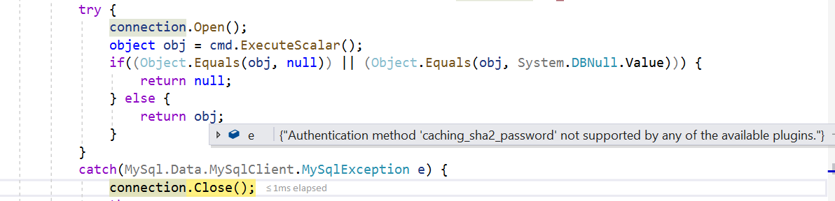 Authentication method 'caching_sha2_password' not supported by any of the available plugins.
