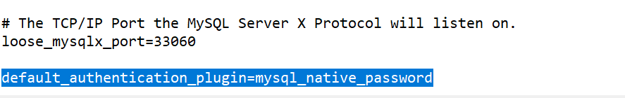 2.2 打开文件my.ini,添加:default_authentication_plugin=mysql_native_password如下: