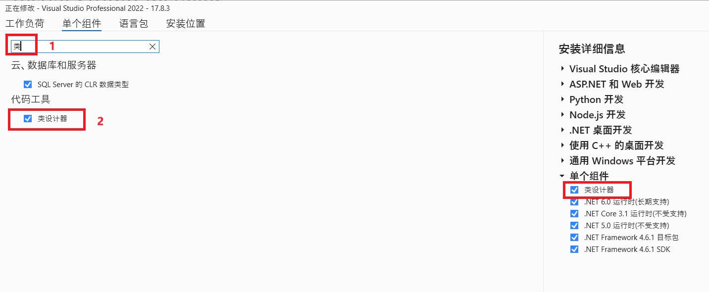 选择【单个组件】面板,在搜索框中输入【类】,下列表中会显示类设计器,勾选,然后点击【安装/更新】