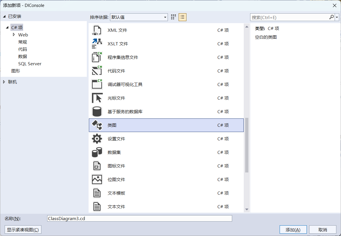 选定项目->右键->添加->新项目->类图,选择合适的部分生成类图,可以选择整个项目或部分内容。
