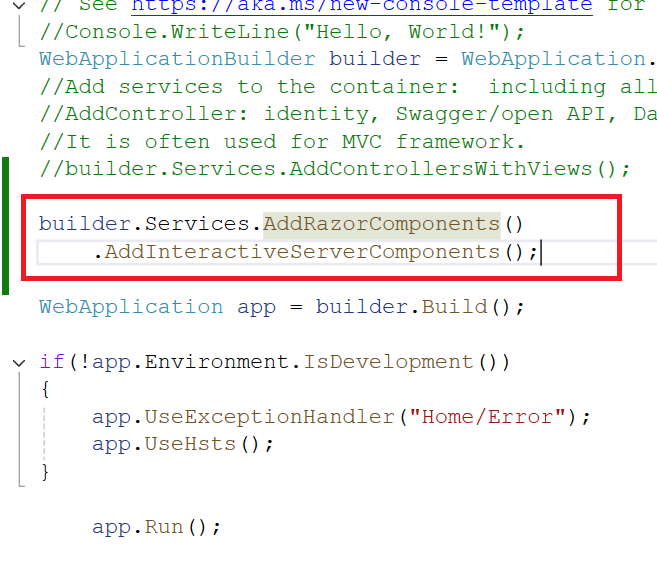// See https://aka.ms/new-console-template for more information //Console.WriteLine("Hello, World!"); WebApplicationBuilder builder = WebApplication.CreateBuilder(args); WebApplication application = builder.Build(); application.Run();